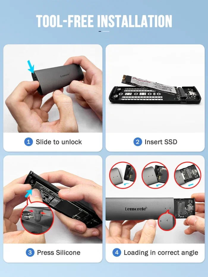 De Lemorele SD1L Portable SSD Enclosure is dé oplossing voor wie op zoek is naar razendsnelle gegevensoverdracht en ultiem gebruiksgemak. Deze hoogwaardige M.2 NVMe SSD-behuizing ondersteunt een overdrachtssnelheid tot wel 10Gbps via USB 3.1 Gen2 en is volledig gereedschapsloos, waardoor installatie binnen seconden geregeld is. Perfect voor data back-up, systeemherstel, klonen of geheugenuitbreiding – zowel thuis als op kantoor.