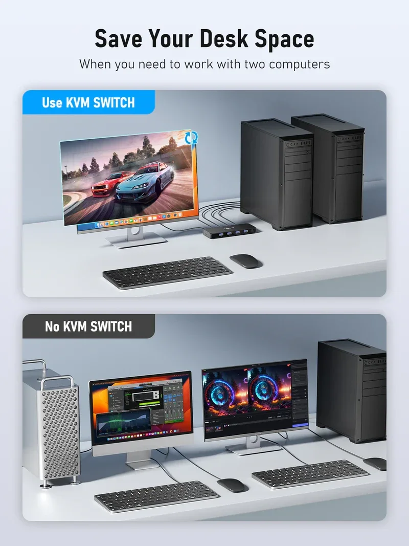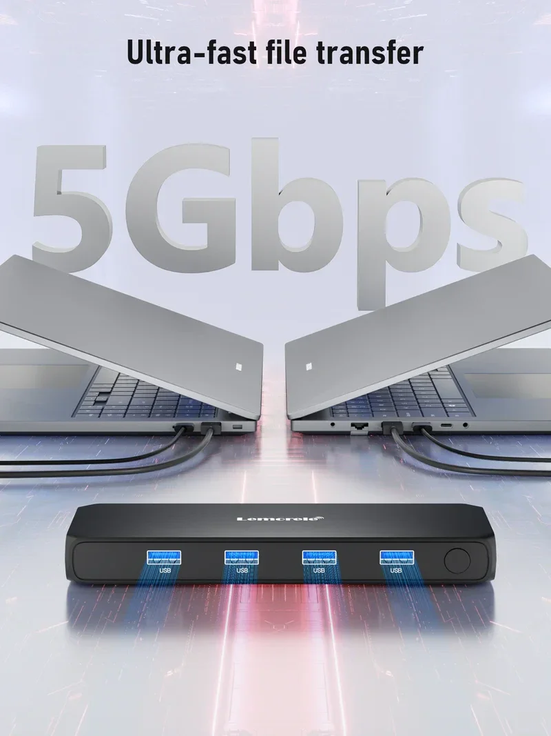 De Lemorele G98 HDMI KVM Switch is de ideale oplossing voor wie efficiënt wil schakelen tussen twee computers met slechts één monitor, toetsenbord en muis. Dankzij de KVM (Keyboard Video Mouse) functionaliteit en 4 USB 3.0-poorten biedt deze switch een snelle, stabiele en georganiseerde werk- of game-ervaring.