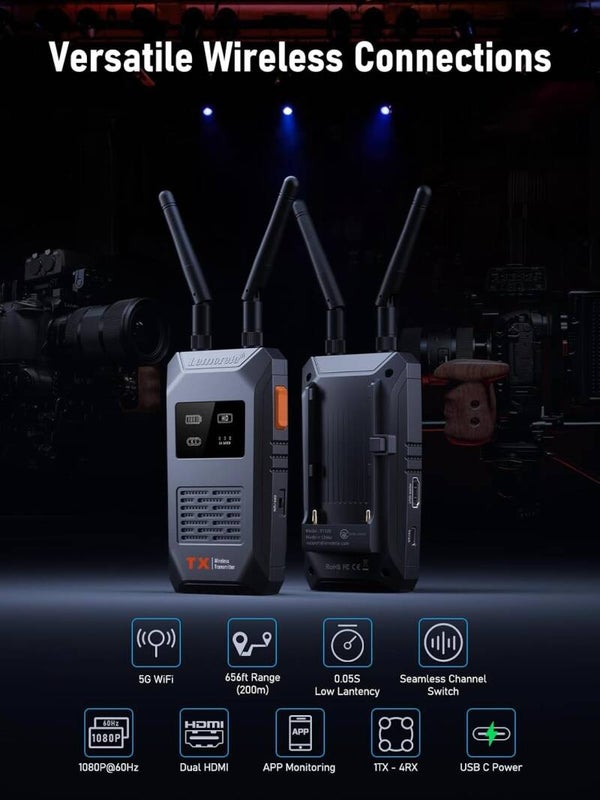 Ontworpen voor gebruik bij filmopnames, live streaming, zakelijke presentaties en videoprojecties, biedt dit systeem een stabiele verbinding over een afstand tot 200 meter met een resolutie van 1080P@60Hz.