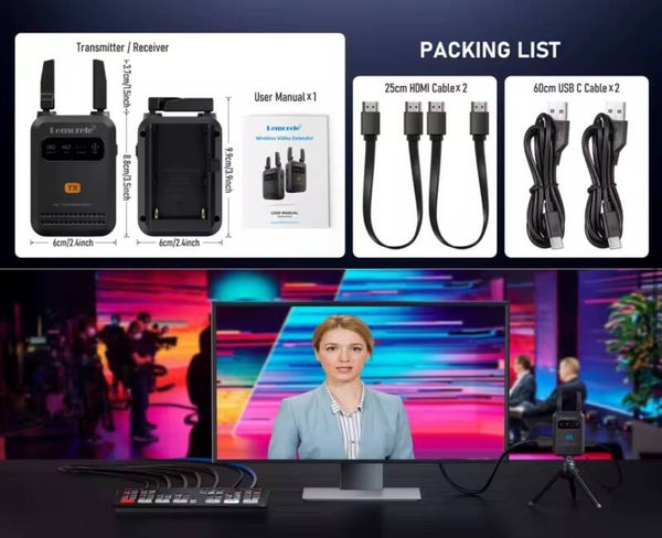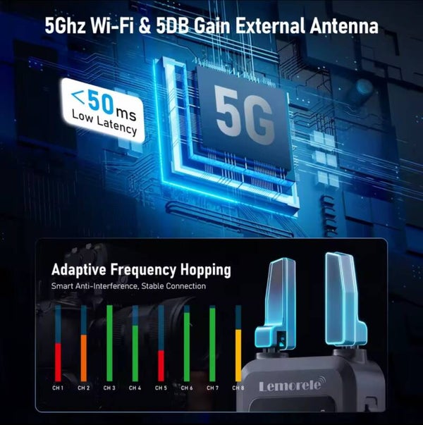 De Lemorele R5000 Wireless HDMI Video Transmission Kit biedt professionele draadloze videotransmissie tot 200 meter, ideaal voor fotografie, videografie, live-monitoring en productie op locatie. Dankzij de stabiele 5GHz dual-antenne-technologie en ondersteuning voor 1080P@60Hz Full HD-kwaliteit geniet je van een scherpe, vloeiende beeldweergave zonder vertraging.